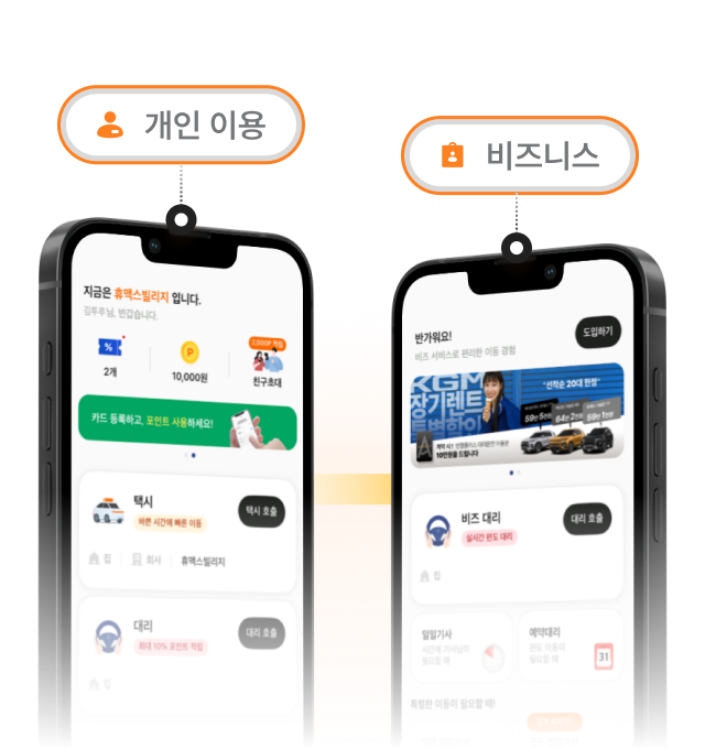 - 기업 고객은 로켓 배차, 예약대리, 일일기사 서비스를 이용할 수 있고 개인적으로 필요할 때 일반 호출 서비스를 앱 하나로 이용할 수 있습니다.